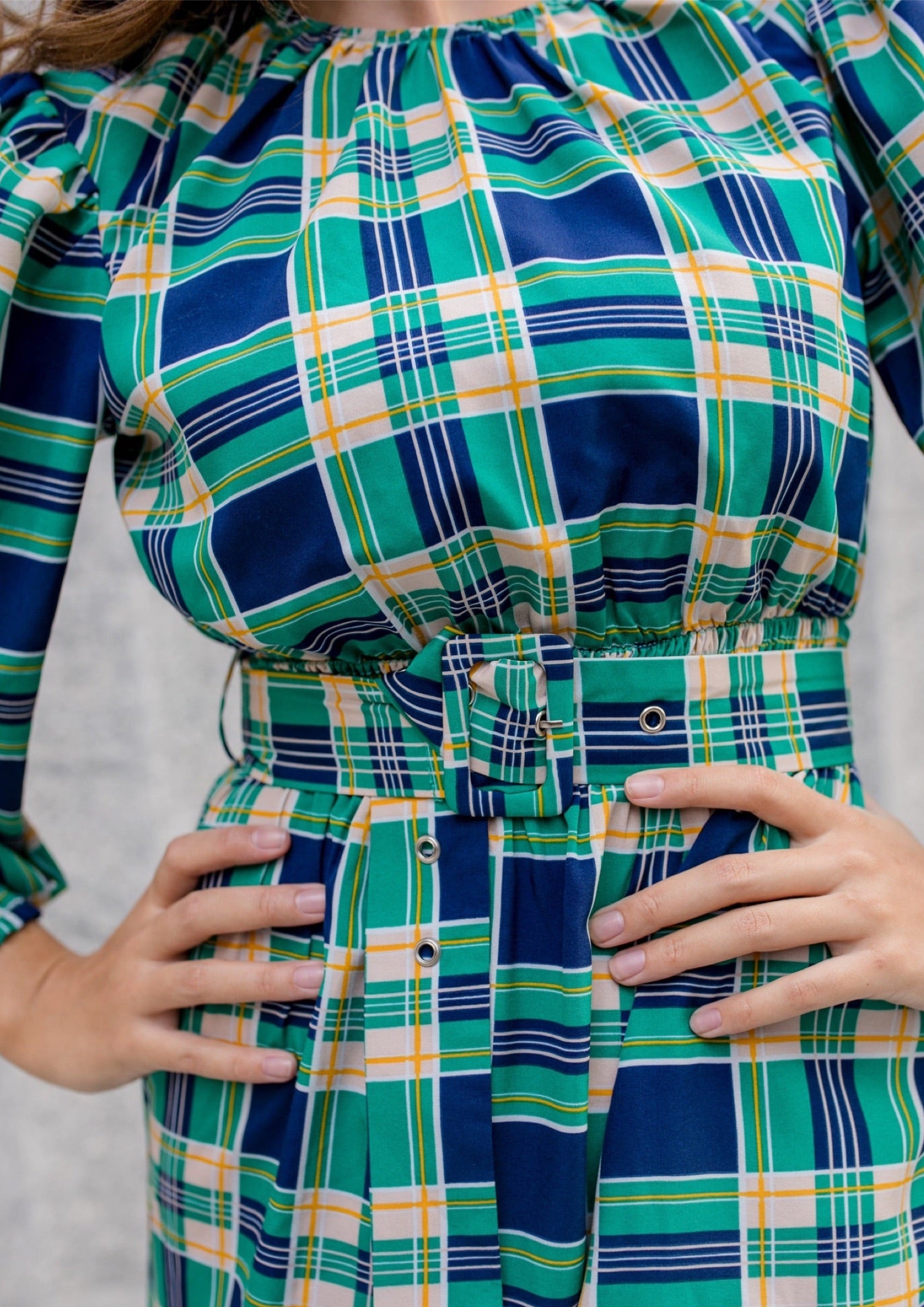 The waist is rows of elastic that can be worn with or without the matching fabric belt.