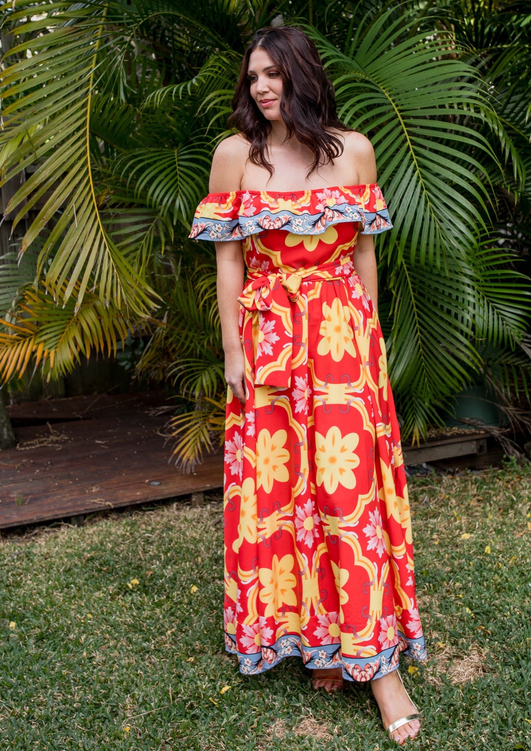 It is an off the shoulder style (that can be worn on the shoulder but sits better off) and it comes with a matching fabric sash and the dress has deep pockets and has a side zipper.